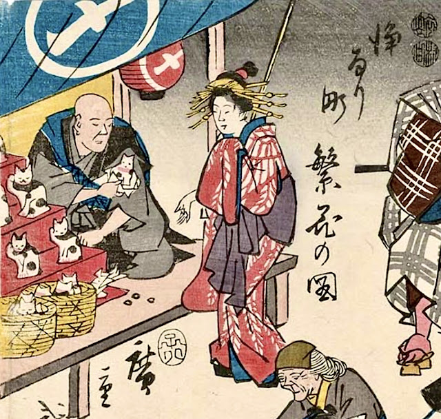 "Joruri-machi Hanka no zu," painted in 1852 by Utagawa Hiroshige. This picture depicts the marushime-neko, a variation of maneki-neko, being sold at Sensō-ji Temple, Tokyo.